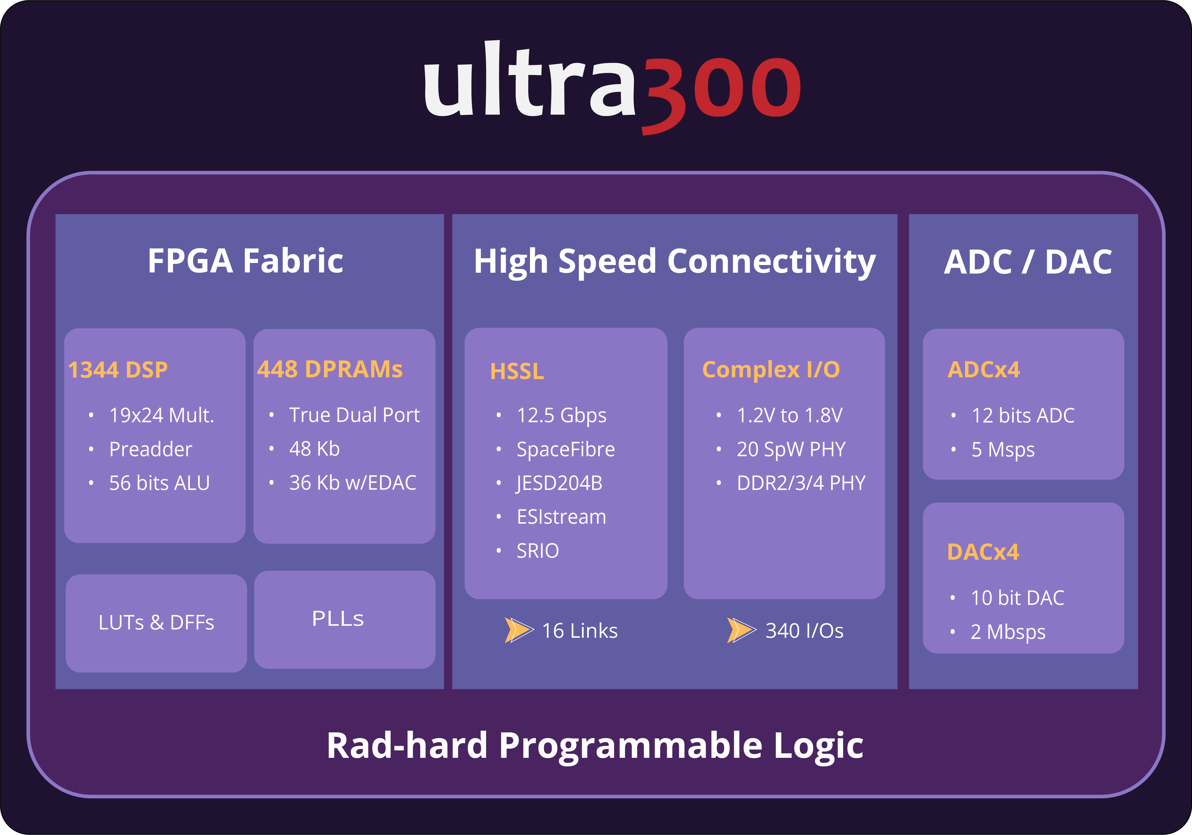 Ultra300 COTS is the commercial version of NanoXplore’s second-generation FPGA family. It shares the same programmable architecture as the radiation-hardened ULTRA 300 devices, including 4-input Look-up Tables with LUT extenders, configurable DFF, Coarse Grain Blocks, embedded memories, and dedicated DSP units. Optimized for industrial and automotive applications, ULTRA 300 COTS combines high logic density, scalability, and performance for cost-sensitive markets.