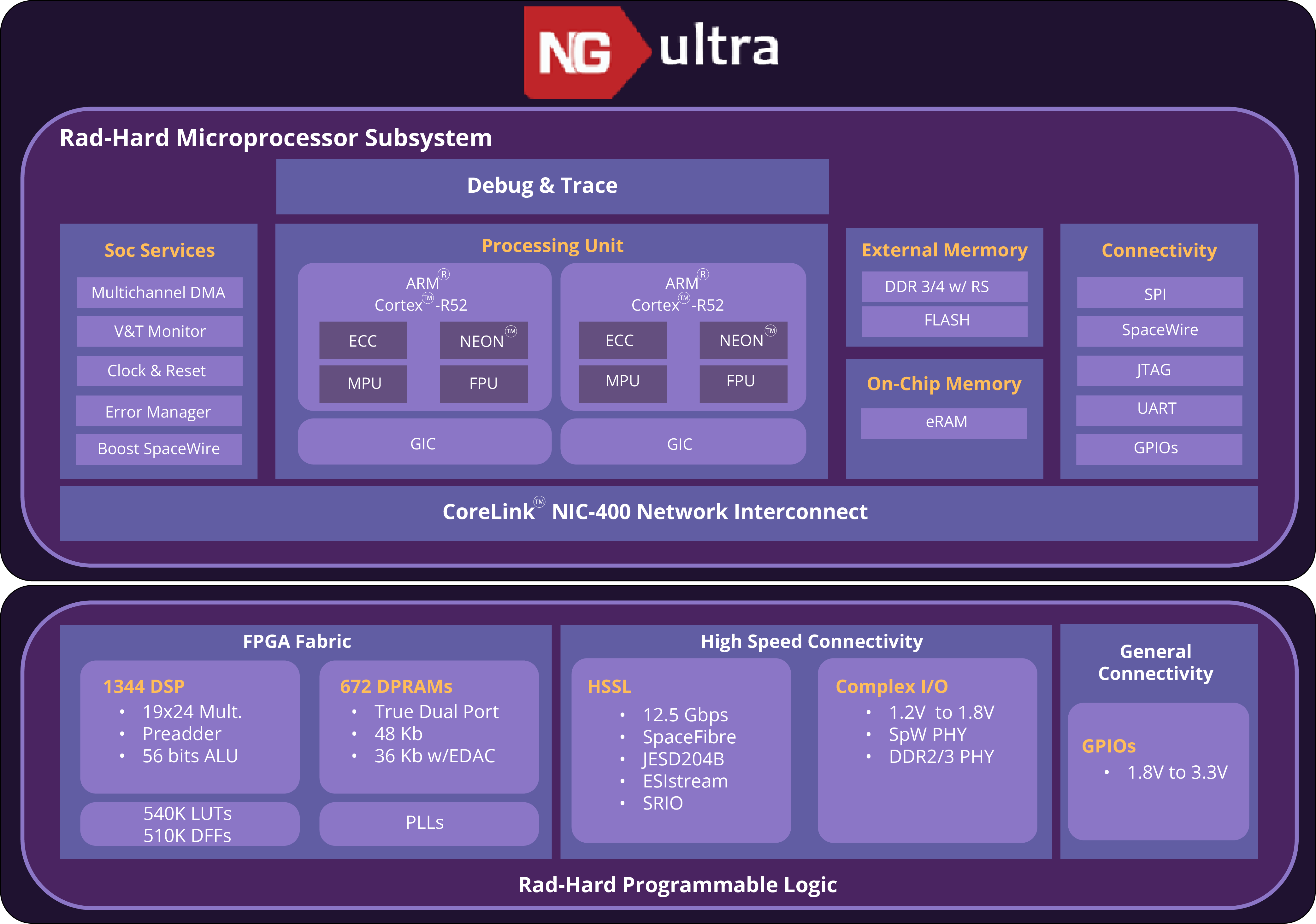 NG-Ultra is the world’s first Radiation Hardened By Design (RHBD) SoC FPGA. His technology is based on patented FPGA architecture developed by NX and industrialized by ST. The hardening techniques used in the NG-ULTRA alongside the FD-SOI technology offers very strong hardening performance.