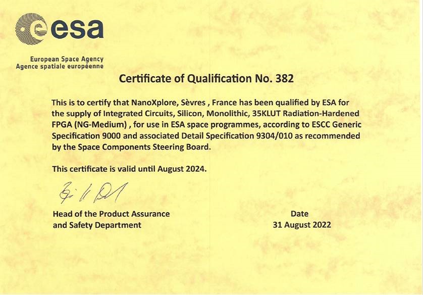 We are proud to announce NanoXplore 65nm NG-MEDIUM FPGA ESCC QPL certification. This is an extremely important milestone for European space products. NG-MEDIUM is the first European FPGA to reach this maturity stage. We expect to obtain similar qualifications for our upcoming new generation 28nm FDSOI technology product family in the near future.